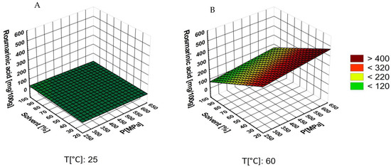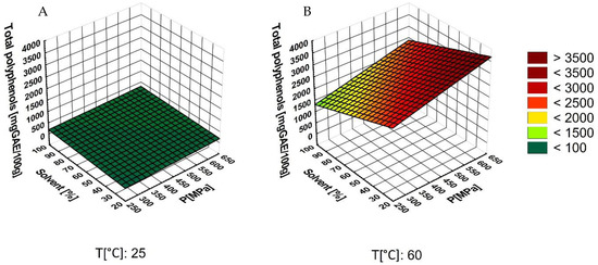 Response surface methodology. Change in the mass fraction of total phenols as a function of the (A) solvent/pressure at 25 °C, and (B) solvent/pressure at 60 °C.
