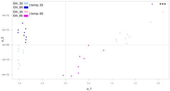 Partial least squares regression (PLS-R) score plot of the total polyphenols, based on y components (u1 and u2). Plots represent the relationship between response variable (total polyphenols) and predictors (temperature and ethanol). Significant effect (p < 0.01) in ‘response–predictor’ relation (performed by using the linear model on PLS-R scores) is indicated by ***.