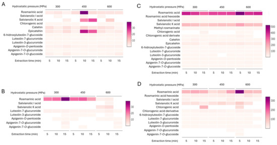 Heatmaps of the polyphenol composition of sage extract, as determined by HPLC. The sage extracts were obtained by extraction under high hydrostatic pressure without different extraction conditions: (A) 30% ethanol and (B) 96% ethanol at a temperature of 25 °C, (C) 30% ethanol and (D) 96% ethanol at a temperature of 60 °C The colours correspond to the percentage of a specific compound in the total peak area (as shown in detail in Table 2 and Table 3).