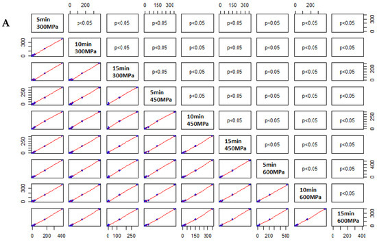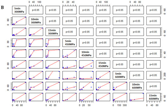 Scatter plot showing correlations between different extraction conditions under high hydrostatic pressure. (A) 30% and (B) 96% ethanol, pressure 300, 450 and 600 MPa, and extraction time 5, 10 and 15 min (on the diagonal), for the chemical composition of sage extract. Significant p-values based on Spearman’s rank test are shown above the diagonal, while bivariate scatter plots are shown below the diagonal.