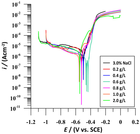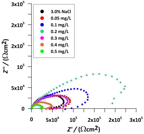 The sage extract obtained by HHP extraction at 600 MPa for 5 min with 30% ethanol concentration at 60 °C was used for further electrochemical analyses. The electrochemical behaviour of tinplate in 3% sodium chloride solution (blank solution) with the addition of different concentrations of sage extract (0.2–2 g/L) at 25 °C was investigated by measuring the potentiodynamic polarisation curve and by using electrochemical impedance spectroscopy (EIS). Figure 7 shows the Tafel diagram for the corrosion of tinplate in a 3%sodium chloride solution in the presence of different concentrations of sage extract (0.2–2 g/L), indicating that the sage concentrations affect the corrosion process. Table 5 and Figure 7 show the calculated values of corrosion current and corrosion potential from the plotted Tafel curves for tinplate in 3% sodium chloride solution with and without sage extract. The addition of sage extract to the blank solution up to concentrations of 0.4 and 0.6 g/L shifted the corrosion potential of the solution to a more positive potential. At concentrations of more than 0.6 g/L, the corrosion potential values shifted to a more negative solution potential (Table 5). Table 5 shows that the OCP values shifted to a more positive potential when sage extract was added to the blank solution (3% NaCl), from −502.9 to −501.0 mV for 0.6 g/L and −453 mV for 0.4 g/L sage-extract concentration. The shift in corrosion potential in the presence of sage extracts (0.4 and 0.6 g/L) ranged from 1.9 to 49.9 mV, indicating that both sage extracts act as mixed-type corrosion inhibitors, since the difference in corrosion potential values does not exceed 85 mV [20,24,36,42,43,44,45]. In addition, the addition of sage extract in 3% NaCl shifts both the anodic and cathodic curves to lower current densities, which also proves that the sage extract acts as a mixed-type corrosion inhibitor [21,22,46]. The curves show the dependence of the current density on the sage extract, i.e., the current density decreases with increasing concentration of the sage extract. The value of icorr decreased from 2.880 for the blank value to 0.202 μA/cm2 in the presence of sage extract (0.6 g/L), which corresponds to a moderately low corrosion level (0.1–0.5 μA/cm2), and we can conclude that the corrosion process was suppressed. The increase in sage-extract concentration shows the changes in Tafel slopes (βa and βc), which means that sage extract acts as a good protective film on the tinplate surface [47,48]. Moreover, the highest inhibitory effect on tinplate was obtained at a concentration of 0.6 g/L in 3% NaCl (93%).