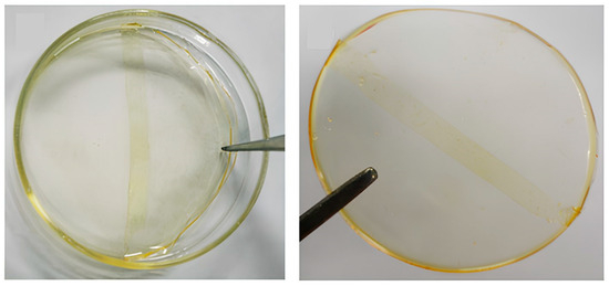 According to Leceta et al. [33], measurements of T and WVTR confirmed that the chitosan-based films, regardless of chitosan’s molecular weight, exhibited transparency (T~88% in the range of 405–780 nm) and demonstrated a water vapor barrier property like that of the PE film (WVTR~8 g/m2/day). This characteristic assists in maintaining the quality of the stored foodstuff. Figure 1, for instance, displays an example of an LMW chitosan-based film. The film appeared light yellow, possibly due to the addition of GLY [33].