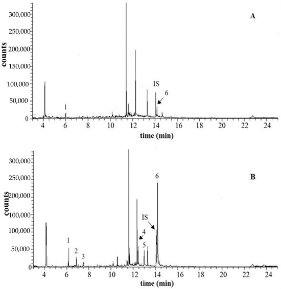 Figure 2. XICs of a beef burger sample at t0 (A) and after the addition of BAs standards (B). The extracted ions were 84, 107, 112, 118, 120, 130, 132, and 170 m/z. The concentration levels in the mixed solution were isobutyl amine (1): 250 µg/g; butylamine (2) and isopentyl amine (3): 20 µg/g; putrescine (4): 100 µg/g; cadaverine (5): 50 µg/g; and tyramine (6): 70 µg/g.