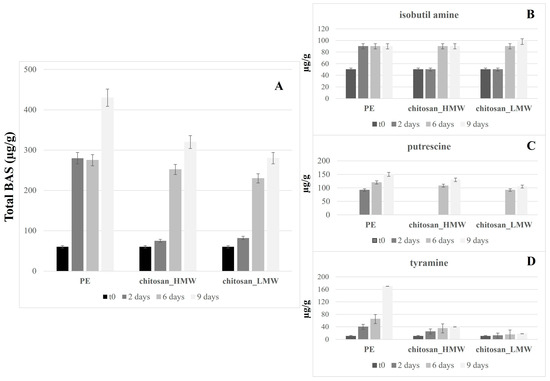 Figure 3. Total BAs (A), isobutyl amine (B), putrescine (C), and tyramine (D) concentration levels in beef burger samples wrapped in commercial PE- and chitosan-based films (LMW and HMW) at different storage times at 8 °C.