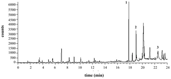 Figure 4. XIC of beef burger sample at t0. The extracted ions were 104, 149, 167, 177, 205, and 223 m/z. The peaks correspond to DEP (1), DPP (2), and DBP (3).