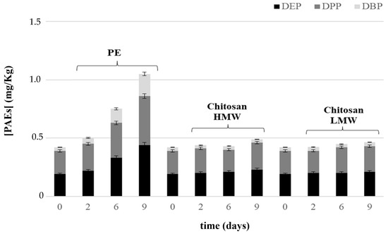 During the storage time, the DEP, DPP, and DBP amounts increased in the meat wrapped in the PE film. No significant variation in PAE concentration was observed for the samples wrapped in both chitosan-based packaging (t-test, p < 0.5), as shown in Figure 5, which reports the total PAE migration levels released by the three tested coatings in beef meat (mg/Kg) at different exposure times at 8 °C, estimated using the developed SPME–GC/MS protocol [39]. The total PAE concentration level was always below 60 mg/Kg, in legal compliance [13].