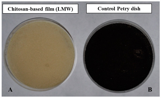 Figure 6. Petri dishes containing the culture medium and 1000 spores of Aspergillus Niger covered (A) and uncovered (B) with the LMW chitosan-based film after 10 days of contact in the dark at 25 °C.