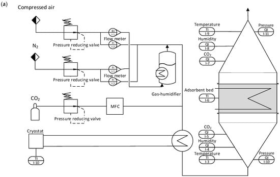 All CO2 adsorption measurements were conducted in an aluminum fixed bed column. Approximately 500 g of adsorbent inside the column was tightly packed and fixed in position with wire meshes. The adsorbent was fully desorbed after each adsorption step. All experiments were carried out using TVSA. The experiment consisted of the adsorbent loading and regeneration phase. The adsorbent loading or adsorption phase was initiated by introducing a CO2/N2- or H2O/N2-loaded air stream for the pure component adsorption data or a CO2/H2O-loaded air stream for the co-adsorption data. During each adsorption step, all operating parameters were kept constant and were recorded at 2 s intervals. Equilibrium was reached when the partial pressure of CO2 measured by sensors before and after the adsorbent bed was consistent, indicating that no further adsorption or desorption was occurring. Various heating and cooling systems were used to ensure isothermal conditions during adsorption. The fluidizing humidifier (bubbler) was held at a constant temperature using a PID controller. The separated dry and humid gas streams are reunited before passing through a heat exchanger, which is temperature-controlled via a cryostat.