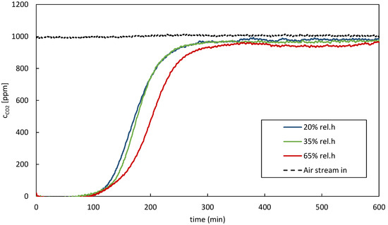 Figure 4 shows the impact of the variation of relative humidity in the supply air stream. Looking at the breakthrough curves with the corresponding CO2 balances confirms the above-stated observations. Higher relative humidity in the supply air stream causes an increase in adsorption time; therefore, an improved CO2 uptake can be confirmed. It is important to mention that some materials may experience a decrease in adsorption capacity due to pore blockage or competition for adsorption sites between water and CO2.