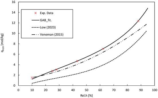 For CO2 capture applications, water adsorption onto solid species is an essential field of study [23,24,25]. The Guggenheim–Anderson–de Boer (GAB) model, an extension of the Brunauer–Emmet–Teller (BET) model, has proven to be the most accurate regarding solid sorbent adsorption. The equation for the GAB model is: