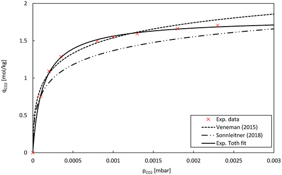 The pure component CO2 adsorption isotherms were modelled using the temperature-dependent Toth isotherm. For amine functionalized adsorbents, this model has proven accurate for higher CO2 partial pressures [16,20,21], as well as in low partial pressure regions, as is the case for direct air capture [9,22]: