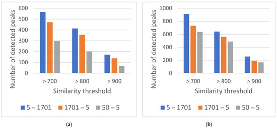 Number of peaks per similarity threshold for polypropylene (a) and synthetic leather (b).