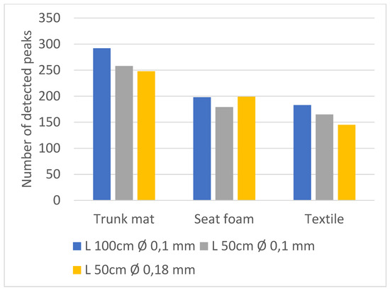 Following the same logical process as in Part A, the performances of the three column configurations were compared for three materials in terms of the number of peaks observed: a trunk mat (multi-layer wood and felt), a PU foam, and a textile. The results are presented in Figure 3. Similarly to Figure 1, the three chosen thresholds share similar behaviours; therefore, only the threshold of 800 is represented here.