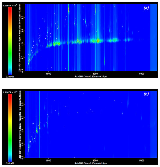 Thus, four configurations for the secondary column were studied: two lengths, 50 and 100 cm, and two combinations of diameters and stationary phase thicknesses, 0.1 × 0.1 and 0.18 × 0.18 mm × µm, to maintain constant the phase ratio of β = 500. After the second column, as a 60 cm transfer line with a matching diameter was added before the mass spectrometer, the length of the secondary column had to be shortened compared to that in Part A. Out of these four configurations, the 100 cm long and 0.18 mm wide one presented abnormally high pressure (ranging from 210 to 363 kPa) and poor separation overall. These two elements point out a probable issue with the column or its installation. Unfortunately, it was not possible to redo the experiments due to the limited number of samples; this configuration was not included in the following results.