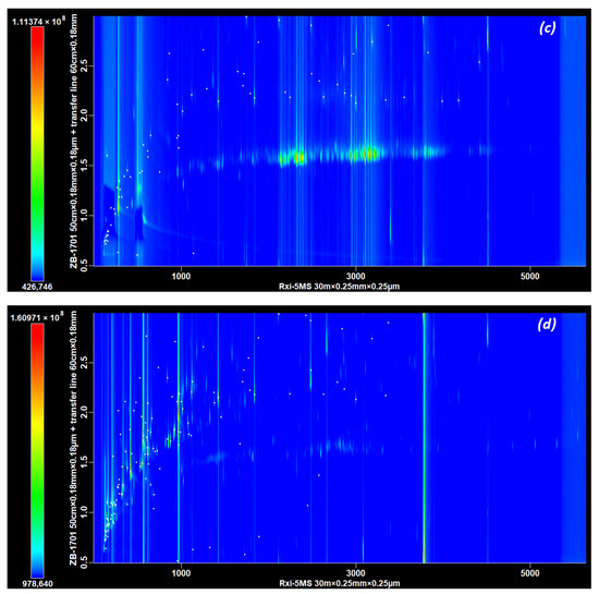 In GC × GC, the secondary column bears the largest part of a pressure drop. For example, a 50 cm column with an internal diameter of 0.1 mm is equivalent to a 20 m column with an internal diameter of 0.25 mm [35]. Therefore, based on the protocol of Part A and the selected column configuration (5–1701), it was decided to study the effects of the secondary column diameter and length on global pressure in order to preserve the thermodesorber. At the same time, the quality of separation already achieved needed to be maintained, a factor that was evaluated by the same means as in Part A, i.e., according to the number of potential odorants observed.