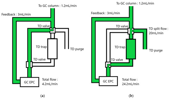 A simplified scheme of the carrier gas flow in the thermodesorber (a) at rest/during program and (b) during injection. Carrier gas flows are represented in green.