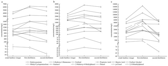The effect of distillation on the content of twelve compounds in crude bamboo vinegar samples 15 (a), 16 (b), 17 (c). Represent the content of twelve compounds in three bamboo vinegars and their fractions, respectively. Error bars are represented in the form of standard deviation (SD, n = 3).