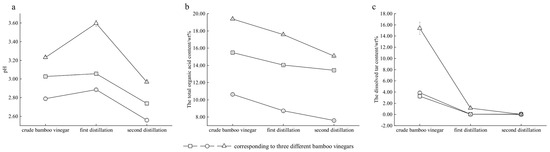 The effect of distillation on the pH of bamboo vinegar (a); The effect of distillation on the total organic acid content of bamboo vinegar (b); The effect of distillation on the dissolved tar content of bamboo vinegar (c). Represent the content of twelve compounds in three bamboo vinegars and their fractions, respectively. Error bars are represented in the form of standard deviation (SD, n = 3).