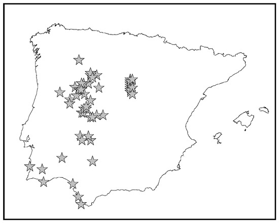 Eryngium galiodes Lam. is a small annual plant (2–30 cm), rarely biennial, that is spinescent in the inflorescences. The roots are more or less fasciculated, dark brown. Stems, 0.1–0.25 cm in diameter at the base, range from almost undivided to profusely branched, often from the base itself, and are straw colored. Basal leaves (2–8 × 0.2–0.12 cm), are sparse, linear-lanceolate or oblanceolate. The cauline leaves are scattered and scarcely branched. Inflorescences on hemispherical capitula, barely visible from the involvement, are sessile or almost so. It produces small fruits in mericarps (1.5 mm), mostly naked, with elongated scales on top [6]. It grows in open dry places in the mid-west of the Iberian Peninsula according to the vouchers that have been revised from different Portuguese and Spanish herbaria (Figure 1). According to the European Nature Information System (EUNIS) and following the International Union for de Conservation of the Nature (Unión Internacional para la Conservación de la Naturaleza: UICN) status, E. galioides is considered endangered [7].