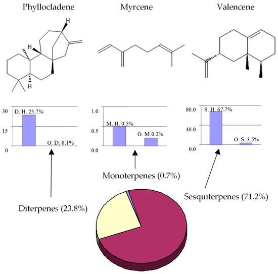 Classification of terpenoids in the essential oil of Eryngium galioides Lam. and the main compound of each class (M. = Monoterpenes; S. = Sesquiterpentes; D. = Diterpenes; H. = hydrocarbons; O. = Oxygenated).