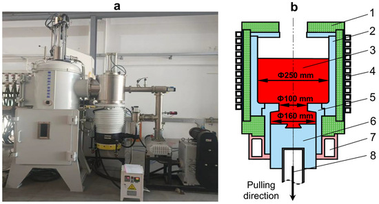 (a) Apparatus for the semi-continuous directional solidification process. (b) Internal structure. Key components: 1. Hard-graphite-felt insulation layer; 2. Graphite crucible; 3. Copper melt; 4. Water-cooled copper induction heating coil; 5. Graphite sleeve; 6. Graphite traction disk; 7. Water-cooled copper tube; 8. Water-cooled stainless steel pulling rod.