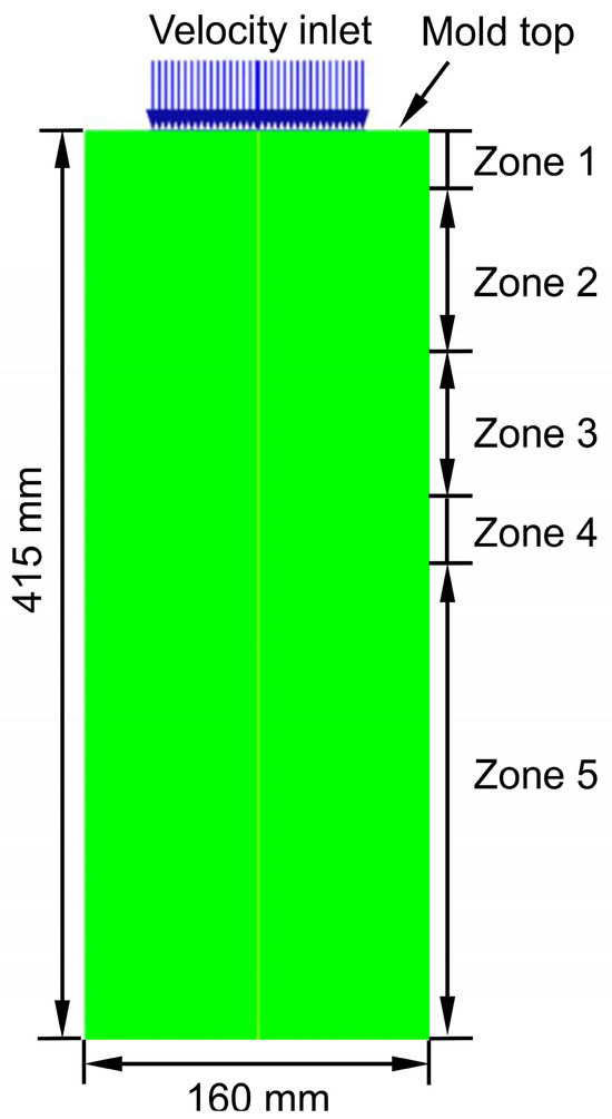 Figure 2 depicts the ingot model geometry (160 mm diameter) and boundary conditions, where the 100 mm diameter melt inlet is the velocity inlet, and all other boundaries employ no-slip conditions with zero solute flux. The initial computation height is 15 mm, with a final ingot height of 415 mm. The model is partitioned into square grids with a 2 mm side length. Following the literature [28], the side walls of the ingot are divided into 5 distinct thermal exchange zones with the surroundings: