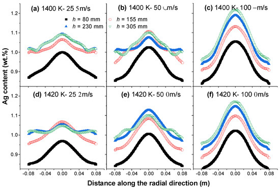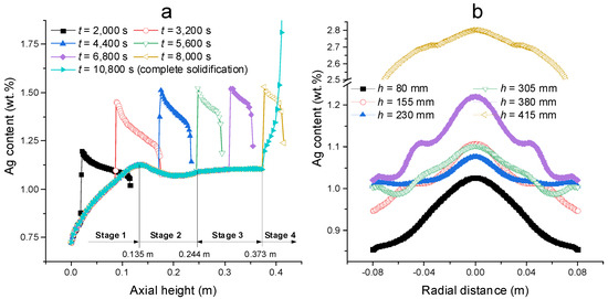 Figure 4 elucidates the distribution profiles of the impurity element Ag along both the axial centerline and the radial direction of the ingot at various time points. Initially, as depicted in Figure 4a, the Ag content along the axial centerline exhibits a continuous rise when the solidification height (h) of the copper ingot is below 135 mm. Within the solidification height range of 135 mm to 205 mm, a gradual decline in Ag content is observed, followed by stabilization at 1.10 wt.% at a height of 244 mm before a notable surge at the height of 373 mm. Furthermore, significant fluctuations in the radial Ag content are observed in Figure 4b, with maximum–minimum differences of 0.17 wt.%, 0.16 wt.%, 0.07 wt.%, 0.11 wt.%, 0.20 wt.%, and 0.39 wt.% at ingot heights of 80 mm, 155 mm, 230 mm, 305 mm, 380 mm, and 415 mm, respectively.