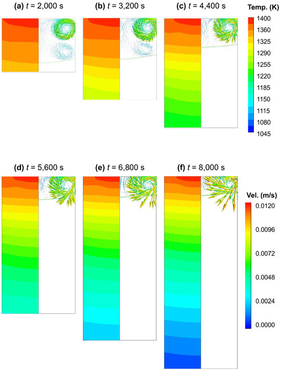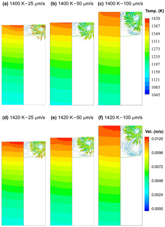 Simulated temporal evolution of the temperature field, flow field, and solid–liquid interface during the solidification process. Melt temperature of 1400 K and a pulling rate of 50 μm/s.