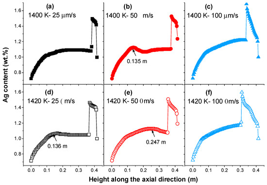 Figure 7 illustrates the radial distribution curves of the impurity element Ag content at different heights of the copper ingot under various process conditions. It is observed that the Ag content exhibits a central enrichment feature along the ingot’s radius, presenting an “A-type” characteristic. Increasing the pulling rate intensifies the degree of Ag element enrichment from the sidewall toward the center of the copper ingot. However, alterations in melt temperature do not produce a consistent pattern in the radial distribution of the Ag content. Specifically, at a pulling rate of 25 µm/s, the radial distribution of Ag content rapidly increases with increasing ingot solidification height and then stabilizes (Figure 7a,d). Similarly, at a pulling rate of 50 µm/s, the distribution trend mirrors that of a pulling rate of 25 µm/s (Figure 7b,e). However, the radial distribution at a pulling rate of 100 µm/s continuously increases with solidification height, differing from the trends observed at lower pulling rates (Figure 7c,f). The impact of pulling rate on the distribution of the impurity element Ag appears more significant than the melt temperature adjustments.