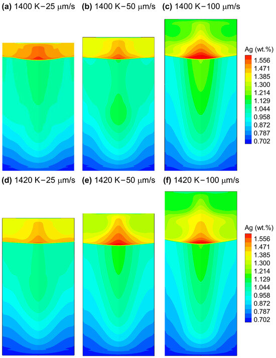 This section elucidates the influence of the pulling rate and melt temperature on the spatial distribution of impurities within copper ingots during the semi-continuous directional solidification process. Numerical simulations were conducted to analyze the Ag content along the axial centerline under six varying process conditions, as depicted in Figure 6. The findings indicate that increasing the pulling rate while maintaining a constant melt temperature significantly enhances the segregation degree of the impurity element Ag. In contrast, keeping the pulling rate constant while altering the melt temperature yields diverse effects on the axial Ag content. For instance, at a pulling rate of 25 µm/s and a melt temperature of 1400 K, the Ag content steadily increases during solidification. However, at a higher melt temperature of 1420 K, an initial rise followed by a slight decrease in Ag content along the axial centerline is observed. Similarly, at a pulling rate of 50 µm/s, the Ag content initially increases and then slightly decreases along the axial centerline, regardless of the melt temperature. Notably, the location of the maximum Ag content differs depending on the melt temperature, occurring around the solidification height of 135 mm for a melt temperature of 1400 K and approximately at the solidification height of 247 mm for a melt temperature of 1420 K. Furthermore, increasing the pulling rate to 100 µm/s results in a continuous increase in Ag content along the ingot’s axial centerline under both melt temperatures.