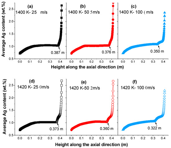 To characterize the impurity separation efficiency of the semi-continuous directional solidification method, the three-dimensional integration of Ag content along the height direction of the copper ingot was performed, yielding the distribution curve of the average Ag content depicted in Figure 10. These curves exhibit a similar pattern under different process conditions, characterized by a gradual increase followed by stabilization, with a rapid increase in Ag content at the late stage of solidification. However, it is crucial to note that at a melt temperature of 1400 K, the critical solidification heights for the rapid increase corresponding to pulling rates of 25 µm/s, 50 µm/s, and 100 µm/s are 387 mm, 376 mm, and 350 mm, respectively, while at a melt temperature of 1420 K, the critical solidification heights corresponding to the three pulling rates are 373 mm, 360 mm, and 322 mm, respectively. Clearly, the critical solidification heights decrease significantly with increasing pulling rate and melt temperature, indicating that lower pulling rates and melt temperatures are advantageous for more effective impurity separation within the ingot.