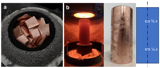 (a) Recycled copper raw material used. (b) High-purity copper ingot obtained by the semi-continuous directional solidification process. Sampling positions along the ingot axial direction for GDMS analysis are indicated.