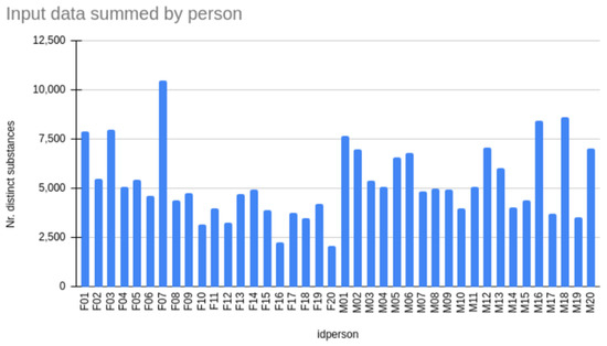 The input data vary in the number of lines (substances) in files (samples). The summary data for persons are provided in Figure 1, e.g., person F07 has four times as many distinct substances in the samples than person F20.