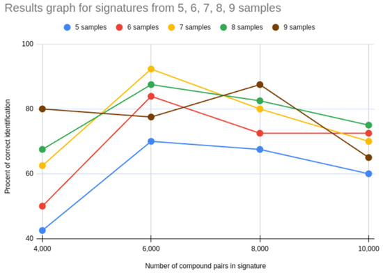 The evaluation was performed repetitively with an increasing number of samples, from which signatures were created. In addition, the total number of these ratios in the signatures was also increased (4000, 6000, 8000, and 10,000), and calculations of the success percentages of the individual identifications were computed (see Table 1 and Table 2).