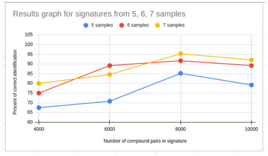 To interpret Table 1, it can be seen, for example, that a percentage value of 92.3 means that out of 40 test samples, 3 were evaluated incorrectly. As the number of samples in the signature increased beyond seven and the number of pairs of compounds in a signature is greater than 6000, the percentage of correct identification starts to decrease. This may be due to inhomogeneity between the samples from different systems (system_1, system_2, and system_3).