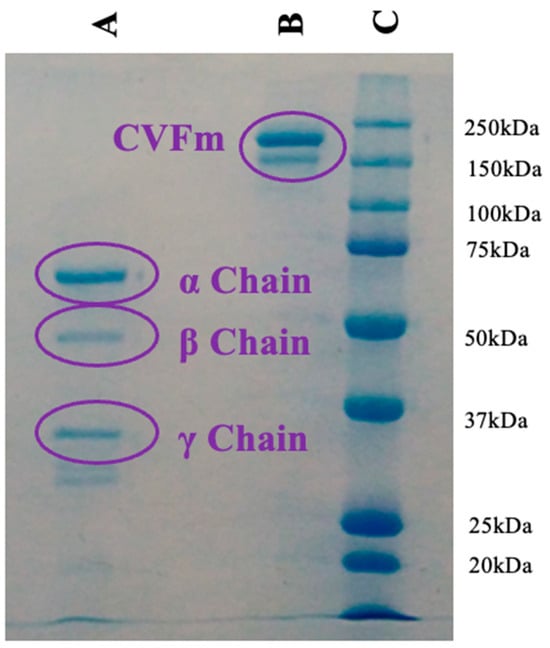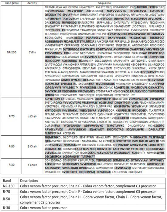 - Osipov, A.V.; Mordvintsev, D.Y.; Starkov, V.G.; Galebskaya, L.V.; Ryumina, E.V.; Bel’tyukov, P.P.; Kozlov, L.V.; Romanov, S.V.; Doljansky, Y.; Tsetlin, V.I.; et al. Naja melanoleuca cobra venom contains two forms of complement-depleting factor (CVF). Toxicon 2005, 46, 394–403. [Google Scholar] [CrossRef] [PubMed]
