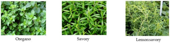 Three aromatic herbs were freshly obtained from a local market in Funchal (Madeira Island, Portugal), namely savory (Satureja hortensis L.), lemon savory (Satureja montana L. var, citriodora), and oregano (Origanum vulgare L.). All samples were milled and homogenized using a grinder (A11 Basic analytical mill, IKA, Staufen, Germany) and stored at room temperature (25 ± 1 °C) until analysis. Images of the examined flowers are shown in Figure 1.