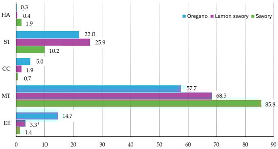 Distribution in relative percentage (%) of chemical families found in the investigated herbs—oregano, savory, and lemon savory. EE: esters; MT: monoterpenic; CC: carbonyl compound ST: sesquiterpenic; HA: higher alcohols.