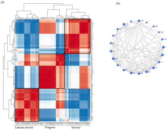 (a) Correlation analysis after data normalization and Pearson’s correlation analysis; and (b) DPSC network using a subset of data selected by setting a Pearson’s correlation coefficient (attribution of the peak numbers is shown in Table S1).