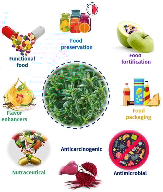 Thymol, the most representative terpenoid of savory, exhibits diverse biological potentials, including antimicrobial, antioxidant, anti-inflammatory, antispasmodic, and anticancer activities. Studies suggest its efficacy in combating bacterial and fungal infections, attributed to its ability to disrupt bacterial cell membranes and inhibit microbial growth, making it effective in extending the shelf life of food products. This terpenoid is commonly utilized in food preservation applications, such as in meat products, dairy items, and beverages, to inhibit the growth of bacteria, fungi, and other microorganisms, thereby enhancing food safety and maintaining product quality [32,33,34,35]. On the other hand, the most representative terpenoid in lemon savory is geraniol. This monoterpene alcohol can be used as a natural preservative in food due to its antioxidant and antimicrobial properties, as a fragrance ingredient in cosmetics, and as a therapeutic agent in cancer treatment and wound healing [36,37]. Carvacrol, a phenolic monoterpene present in oregano, exhibits notable biological properties, including antimicrobial, antioxidant, anti-inflammatory, and anticancer activities.
