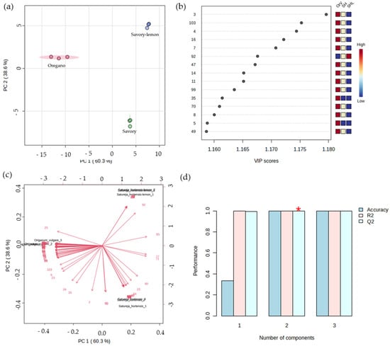 PLS-DA of the volatilomic pattern of aromatic herbs (n = 3 for each data point): (a) score scatter plot; (b) VIP scores; (c) biplots of all analyte targets identified in CAHs; and (d) select an optimal number of components for classification (attribution of the peak numbers is shown in Table S1). * Indicates the best estimate value of the predictive ability of the model, and is calculated via cross-validation (CV).