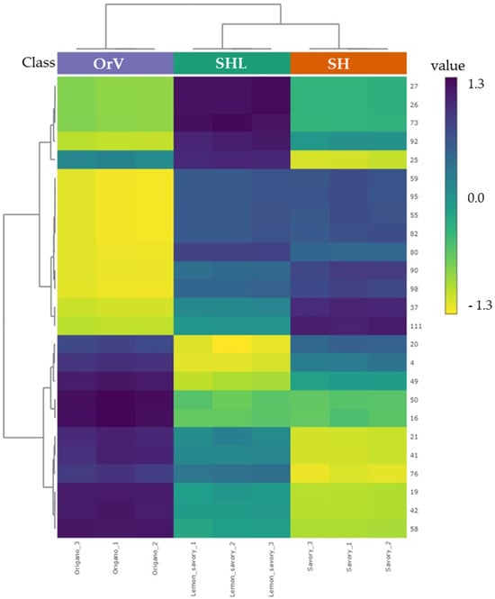 The dendrogram and heatmap representing the 112 VOMs released from oregano (OrV), savory (SH), and lemon savory (SHL) considering the GC-MS peak areas after autoscaling, generated by Euclidean distance and Ward’s clustering (attribution of the peak numbers is shown in Table S1). The relative content of each volatile is illustrated through a chromatic scale (from yellow-green to violet, the minimum and the maximum, respectively).