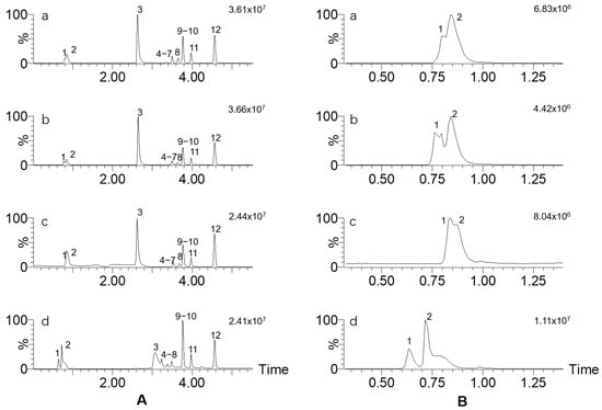 (A) TIC chromatograms of 12 mushroom toxins using different ammonia buffers and methanol as mobile phase; (B) partial enlargement at 0.25~1.4 min from (A). Ammonia buffer: a, ammonium fluoride; b, ammonium formate; c, ammonium acetate; d, ammonium carbonate. The toxin numbers are the same as in Figure 1.