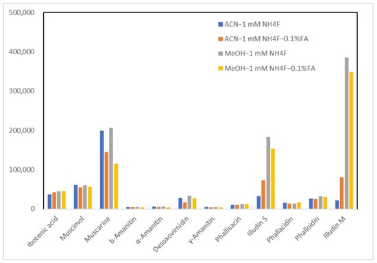 Peak response of 12 mushroom toxins using different mobile phase components. Abbreviations in the legend: ACN, acetonitrile; MeOH, methanol; NH4F, ammonium fluoride; FA, formic acid.