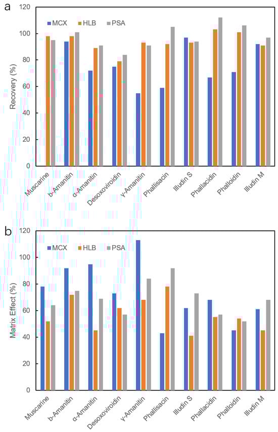 Recovery (a) and matrix effect (b) of 10 mushroom toxins in serum extracts after different SPE purifications.