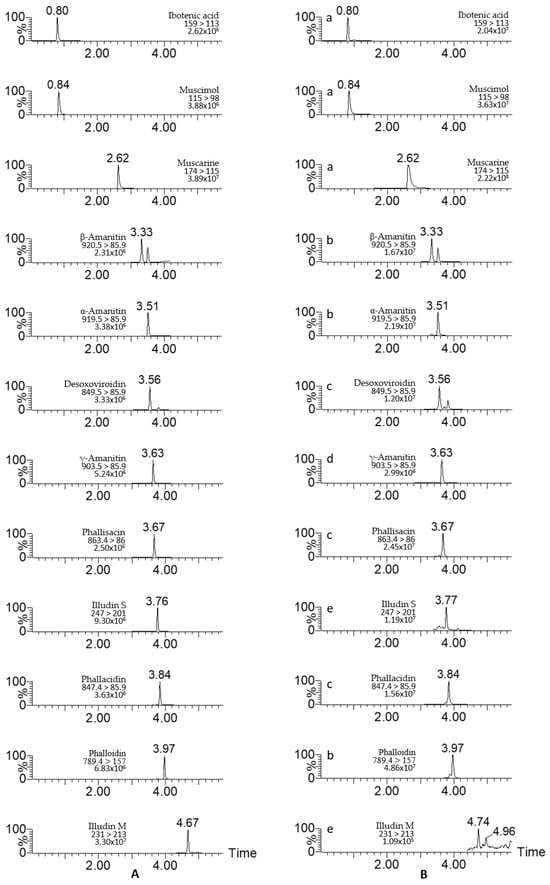 LC-MS/MS chromatograms of 12 mushroom toxins in standard solution (A) and wild mushroom samples (B). Mushroom species: a, Amanita pseudosychnopyramis; b, Amanita pallidorosea; c, Amanita exitialis; d, Amanita subjunquillea; e, Omphalotus olearius.