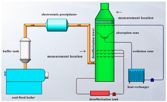 The experimental setup, as depicted in Figure 1, comprises a fully automated coal-fired boiler, a buffer tank, an ESP system, and a single tower with double-circulation desulfurization. The rated flue gas volume of the boiler is 350 Nm3 h−1. The flue gas produced by the boiler was introduced into the buffer tank for thorough mixing before passing through the ESP, where larger particles (the particle size is above 10 μm) could be removed. Subsequently, the flue gas entered the desulfurization tower. The spray layer of the desulfurization tower consists of two distinct zones, namely the oxidation zone and absorption zone. These zones were controlled separately, unlike traditional wet flue gas desulfurization systems. The desulfurization slurry in the oxidation zone was cooled by a heat exchanger, leading to the creation of a supersaturated vapor environment that enhanced the removal efficiency of fine particles (the particle size is less than 10 μm). The desulphurization slurry in the oxidation zone is recycled to the slurry tank in the oxidation zone after spraying. The desulphurization slurry in the absorption zone is collected by the tray after spraying, and then circulates into the slurry tank in the oxidation zone. The systems are independent of each other. The pH of the desulfurization slurry in the oxidation zone typically ranged between 4.0 and 5.0, facilitating the absorption of some SO2 from the flue gas. In contrast, the pH of the desulfurization slurry in the absorption zone generally fell between 5.6 and 6.2, enabling the deep removal of SO2 from the flue gas. Furthermore, the desulfurization tower was equipped with a highly efficient demister at the top to eliminate larger condensable droplets. The average flow rate of flue gas inside the tower was controlled at 3.5 m/s. The measurement position is the inlet and outlet position of the desulfurization tower, and the measurement is continuous. It was tested three times for each measuring point under each working condition, and the average value was finally taken.