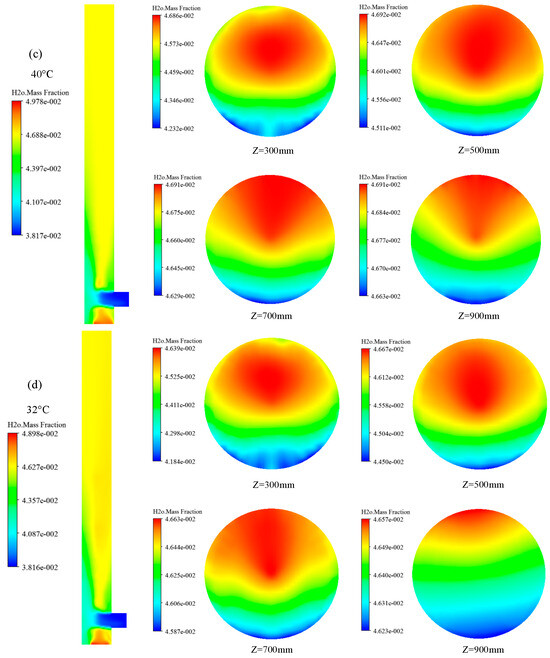 Figure 3 illustrates the distribution of water vapor and temperature inside the desulfurization tower under typical conditions. These include Condition 1 (inlet flue gas temperature of 120 °C, desulfurization slurry temperature in the oxidation zone of 40 °C, and desulfurization slurry temperature in the absorption zone of 32 °C) and Condition 2 (inlet flue gas temperature of 120 °C, desulfurization slurry temperature of 40 °C). Figure 3a,b depict how temperature varies with the height of the desulfurization tower, while Figure 3c,d display the distribution of the water mass fraction in the tower. The results indicate that heterogeneous condensation significantly affects the distribution of water vapor and temperature in the desulfurization tower. The temperature gradient remains relatively constant between the heights of 300 mm and 700 mm in the tower, but fluctuates significantly at the 900 mm mark, resulting in a sharp decrease in water vapor content. Simulation results reveal that the supersaturation levels at heights of 700 mm, 900 mm, and the tower outlet are 0.8839, 0.9318, and 0.9334, respectively, under Condition 2, and 1.0762, 1.3393, and 1.3431, respectively, under Condition 1. It is evident that a supersaturated vapor environment cannot exist in the desulfurization tower without external conditions. The supersaturated vapor environment can be achieved by reducing the temperature of the desulfurization slurry. It can be concluded that under the condition where the inlet flue gas temperature of the desulfurization tower is 120 °C, the desulfurization slurry temperature in the oxidation zone is 40 °C, and the liquid–gas ratio is 15 L/Nm3, the critical condition for heterogeneous condensation occurs when the temperature of the desulfurization slurry in the absorption zone drops by 8 °C.