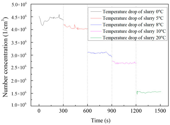 Figure 9 illustrates the variation in fine particle number concentration at the exit of the desulfurization tower under the constant temperature of the slurry in the oxidation zone and varied temperatures of the slurry in the absorption zone. The fine particle concentration decreased from 7.32 × 106 1/cm3 to 3.07 × 106 1/cm3 with the temperature drop of the desulfurization slurry in the absorption zone increasing from 0 °C to 20 °C.