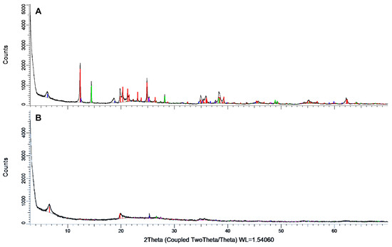 The XRD spectrum of Li-bearing clay minerals before (A) and after (B) roasting. Red line, Kaolinite.